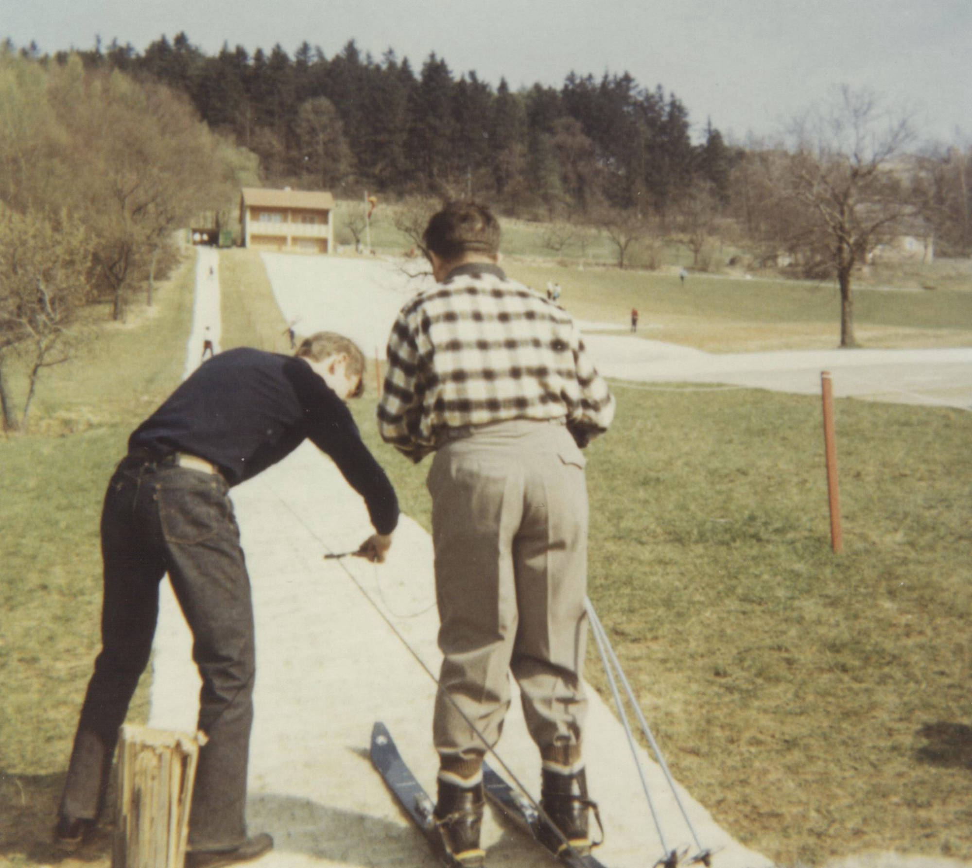 Im Bereich des Schanzenauslaufs muss berücksichtigt werden, dass die Wiese außerhalb der Wintersaison vom Besitzer genutzt werden kann: außerdem ist eine Ausfahrt aus dem Grundstück nötig. Eine Planierraupe soll die Arbeiten im Auslauf unterstützen, jedoch es entsteht mehr Schaden als Nutzen: Sie rutscht über die Böschung eines angrenzenden Grundstücks, drückt den Zaun ein und schiebt allerhand Erdmassen auf das Anwesen. In mühevoller Kleinarbeit fahren die Rothenberger selbst per Schubkarren die Erde aus dem Grundstück. Drei wertvolle Samstage müssen dafür geopfert werden.